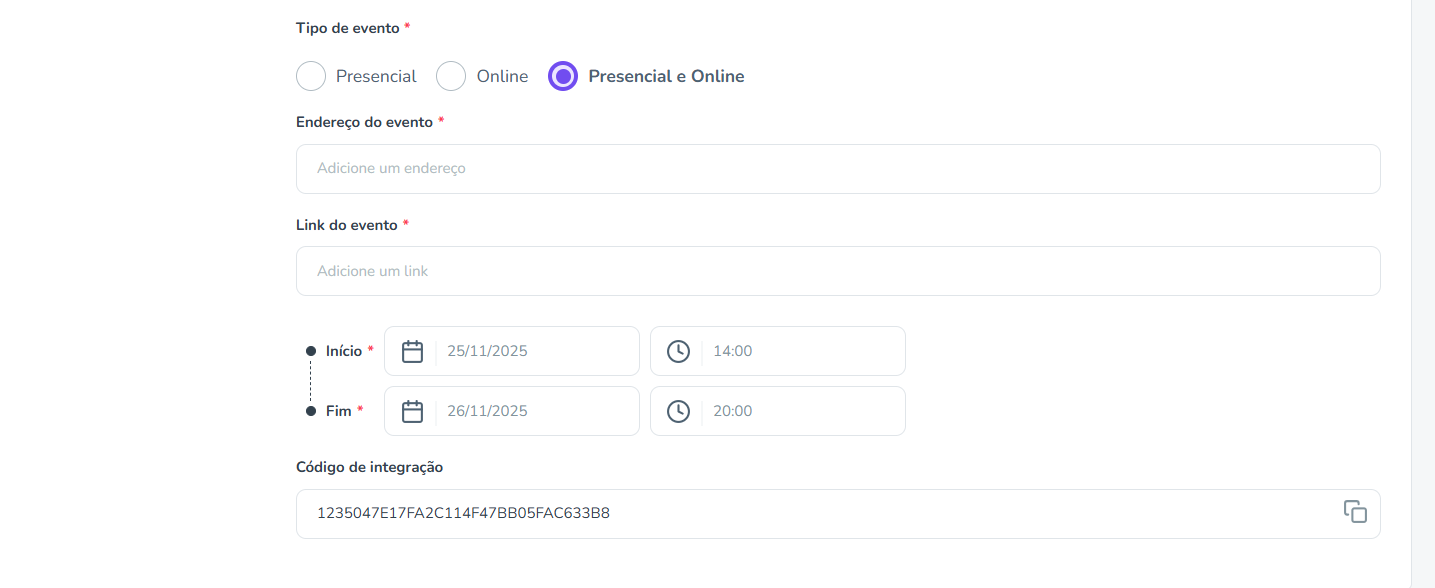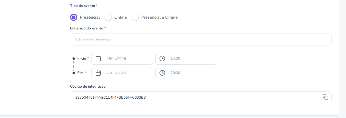 Ao selecionar Presencial, será necessário informar o endereço do evento, além das datas e horários.