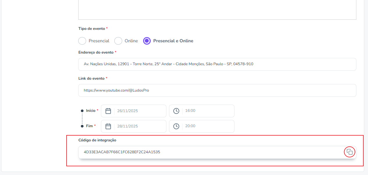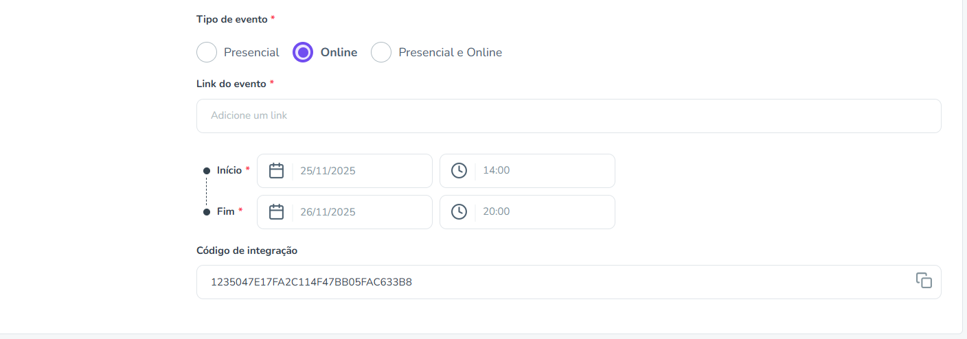 Ao selecionar Online, o sistema exibirá o campo Link do evento (obrigatório), além de data/horário.