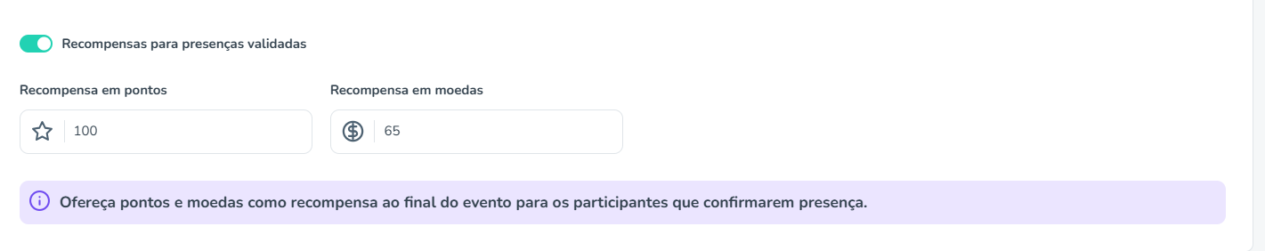 Ao ativar a opção “Recompensa para presenças validadas”, você poderá definir: