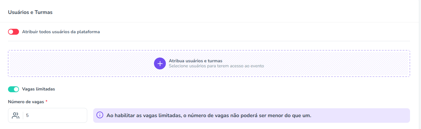 Atribuir usuários e turmas - Essa opção é ideal para eventos direcionados, treinamentos internos ou grupos específicos.