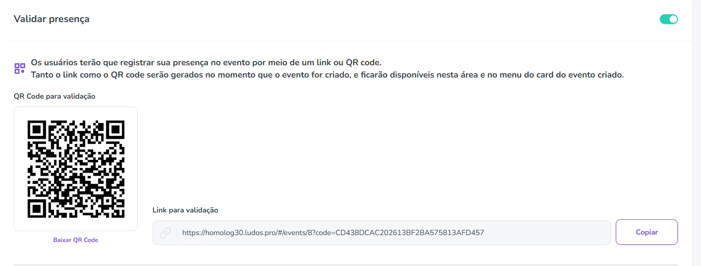 Ao ativar a opção Validar presença, você poderá controlar quem realmente participou do evento por meio de um QR Code ou link de validação.