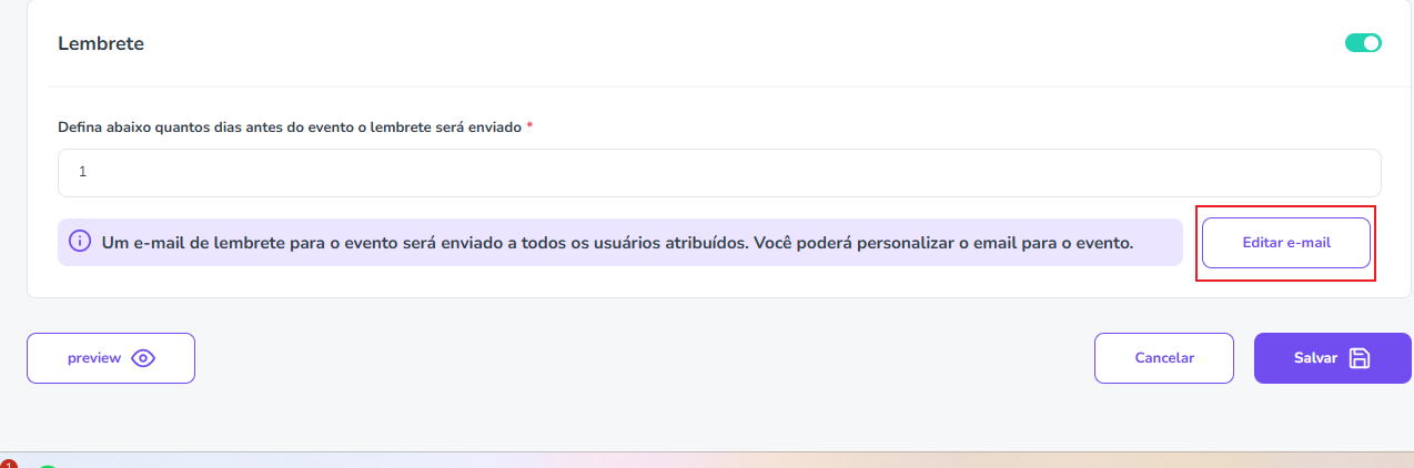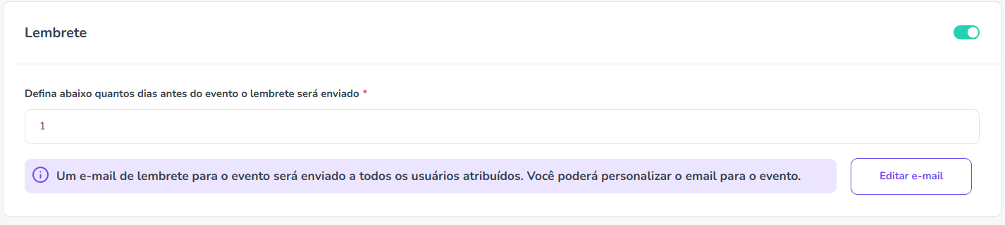 Basta inserir o número no campo disponível (ex.: “1” envia o lembrete um dia antes).