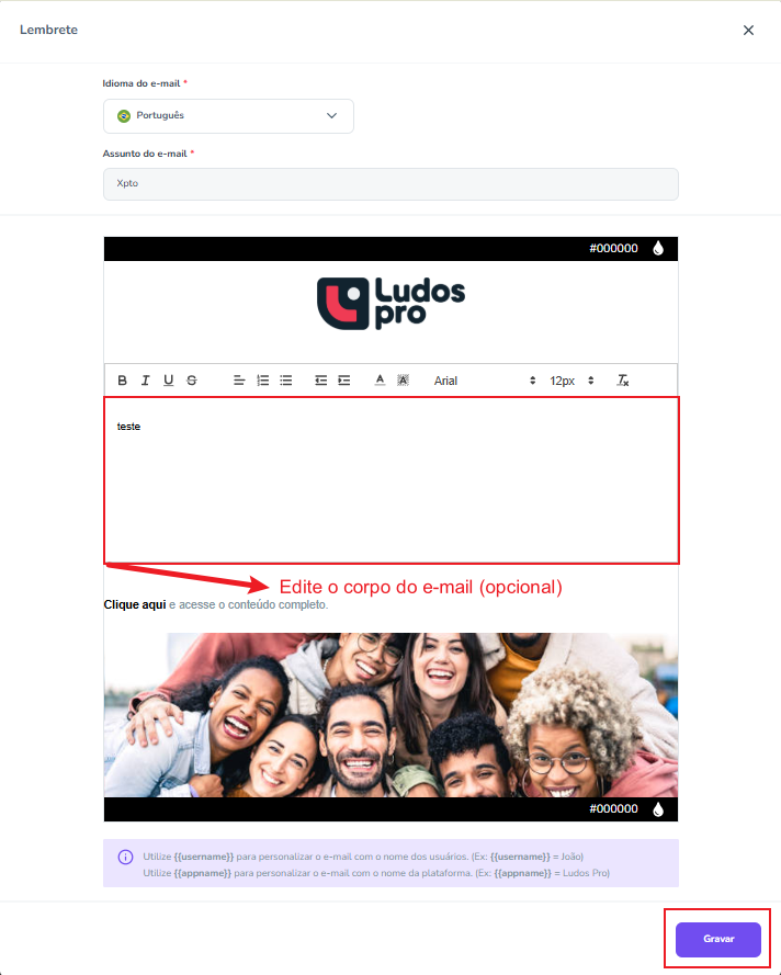 A plataforma permite que você personalize o conteúdo do e-mail de lembrete.