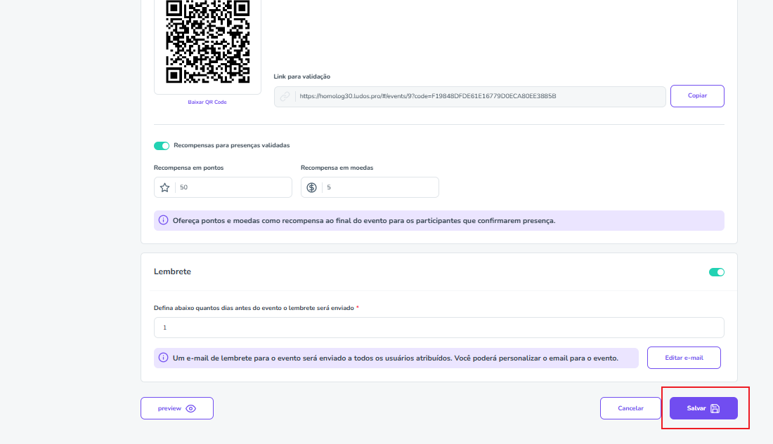 Nesta etapa, você pode incentivar a participação oferecendo recompensas aos usuários que tiverem sua presença validada no evento.