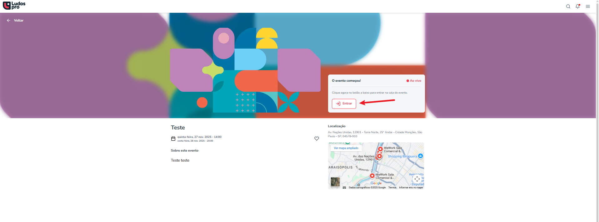 Quando usuário clica em entrar, é redirecionado para o link do evento online.Para confirmar presença: o usuário precisará ler o QR Code gerado pelo administrador ou fazer o login pelo link do evento enviado pelo administrador (feito isso o usuário poderá receber pontos e moedas se forem concedidos, ou certificado) ou somente confirmar presença.