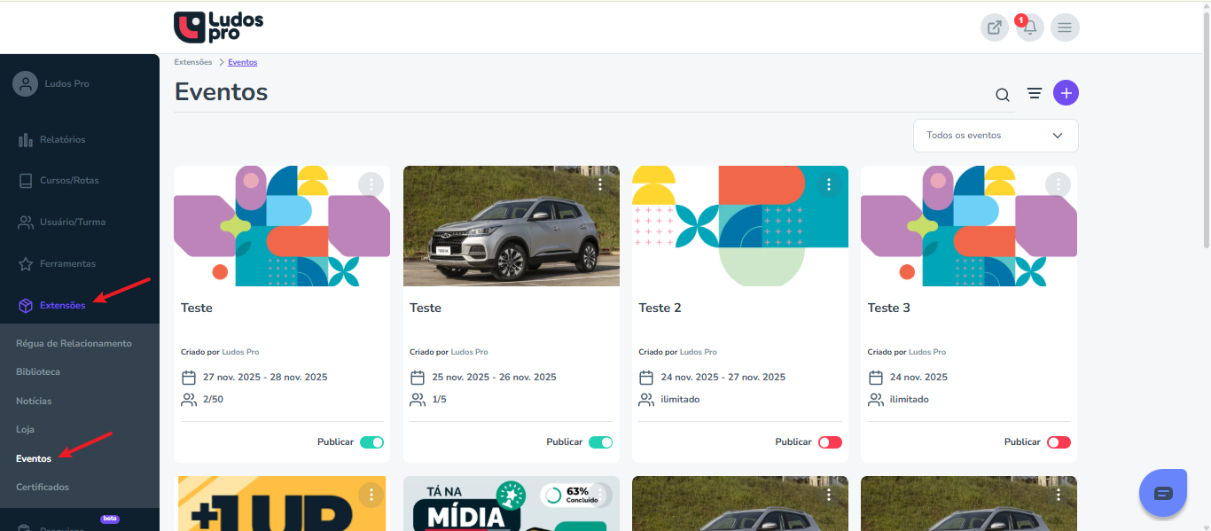 Os eventos dentro da plataforma Ludos Pro servem para avisar seus usuários sobre a ocorrência de atividades com datas definidas. Eles podem ser limitados por número de vagas com lista RSVP ou abertos para todos os usuários da plataforma ou turmas associadas. Nesta atualização da Ludos Pro, o cadastro de eventos ficou mais completo e permite escolher entre três formatos: Presencial, Online ou Presencial e Online.
