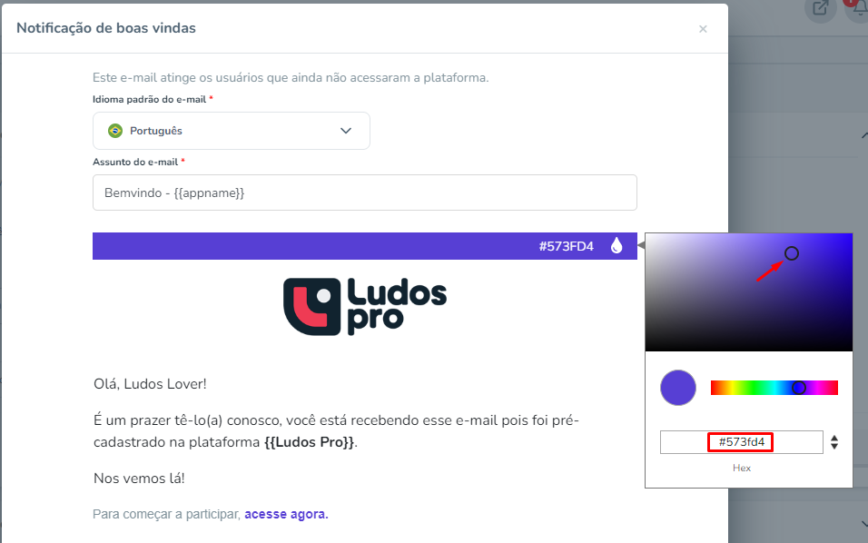 Pode mudar a cor do e-mail passeando com o mouse ou inserindo a sua hashtag de cor utilizada: