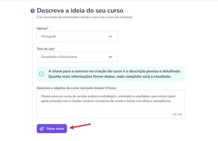 Quanto mais clara for a descrição, melhor será o resultado gerado pela IA. O campo de descrição aceita até 550 caracteres. Depois, clique em “Gerar curso”: