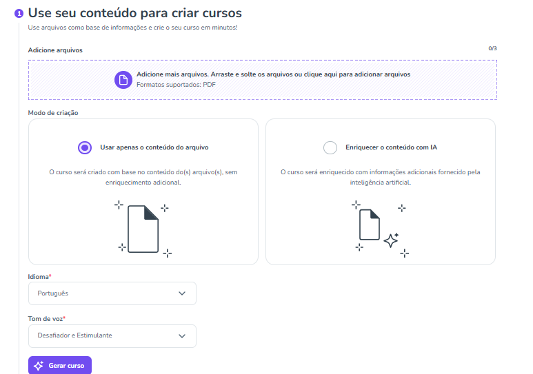 Criação a partir de arquivos: você envia materiais próprios para que a IA utilize como base.