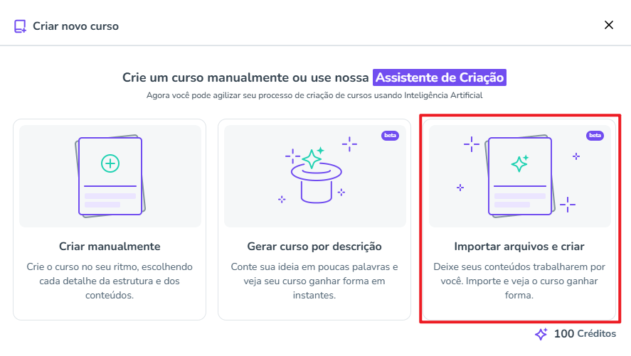 ⚠️Importante: O uso da Inteligência Artificial consome Créditos IA do seu plano, esse consumo pode variar de acordo com a forma de criação escolhida para o curso