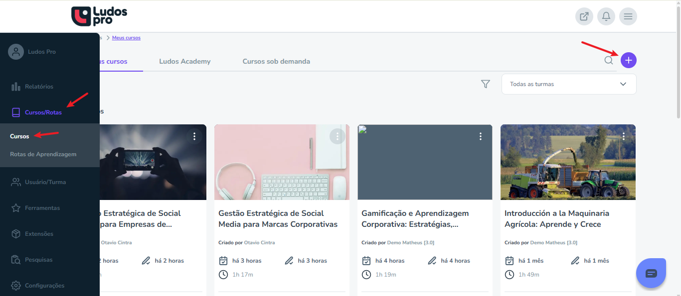 No menu lateral da plataforma, clique em Cursos/Rotas. Em seguida, no canto superior direito, clique no botão “+” para iniciar a criação de um novo curso.
