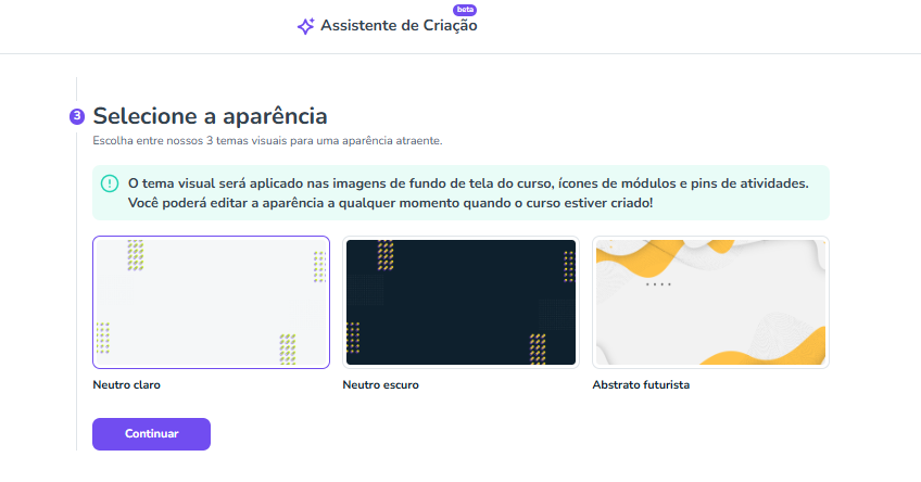 Selecione “Usar assistente de criação” para criar seu curso com IA.