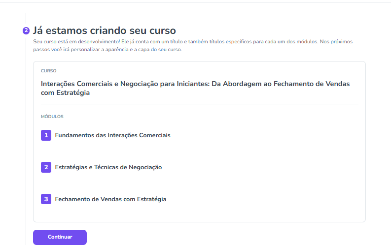 Na tela seguinte a plataforma irá apresentar o título do curso e os módulos criados (você poderá editar essas informações ao final da criação do curso, se desejar).