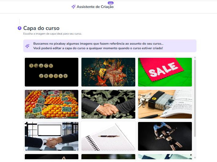Após escolher a imagem de capa do curso, selecione o botão “Finalizar curso agora!” localizado ao fim da tela e o seu curso estará finalizado.